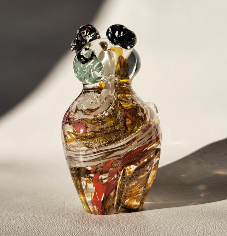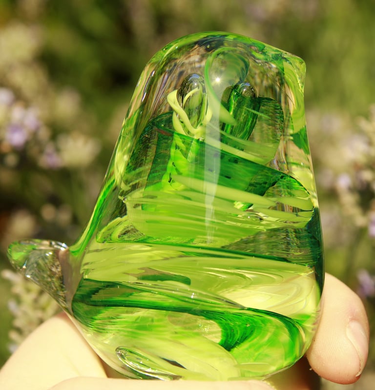 Have the ash spiraled with three colours inside in one of our sculpted glass birds